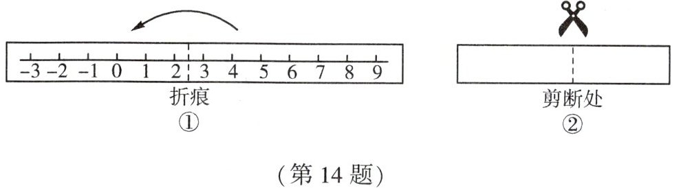 14. 数轴是中学数学教材中数形结合的第一个实例,揭示了“数”和“形”之间的内在联系。小华在一张长方形纸条上画了一条数轴,进行如下操作:如图①,在数轴上剪下 $ 12 $ 个单位长度(从 $ -3 $ 到 $ 9 $)后得到的一条线段,过线段上某点将纸条向左折叠;如图②,然后在重叠部分的某处剪一刀,展开后得到三条线段,发现有折痕的线段长度为 $ 6 $,另外两条没有折痕的线段长度之比为 $ 1:2 $。试求出折痕处对应的点所表示的数。
