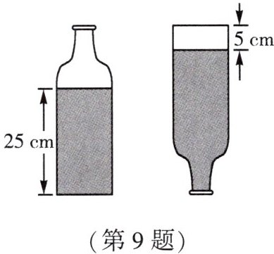 9. 如图,一个瓶子的底面是半径为4cm的圆,瓶内装着一些溶液。当瓶子正放时,瓶内溶液的高度为25cm;倒放时,空余部分的高度为5cm。现把瓶子装满溶液,再把全部溶液倒在一个正方体容器里,容器内的溶液高度为10cm。求: