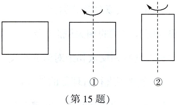 15. 探究:有一长9 cm,宽6 cm的长方形纸板,现要求以其一组对边中点所在直线为轴旋转180°,得到一个圆柱。现可按照两种方案进行操作,方案一:以较长的一组对边中点所在直线为轴旋转,如图①;方案二:以较短的一组对边中点所在直线为轴旋转,如图②。