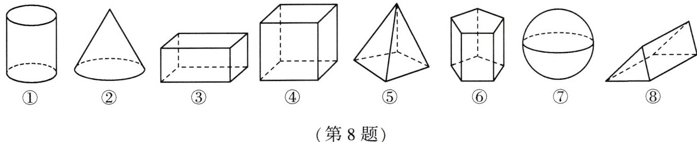 (2)柱体有①③④⑥⑧,锥体有②⑤,球体有⑦
