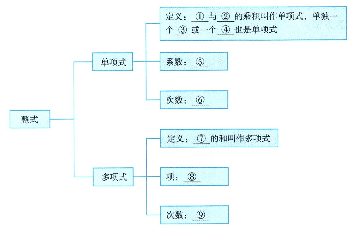 ①数;②字母;③数;④字母;⑤单项式中的数字因数;⑥所有字母的指数的和;⑦几个单项式;⑧组成多项式的每个单项式;⑨次数最高项的次数