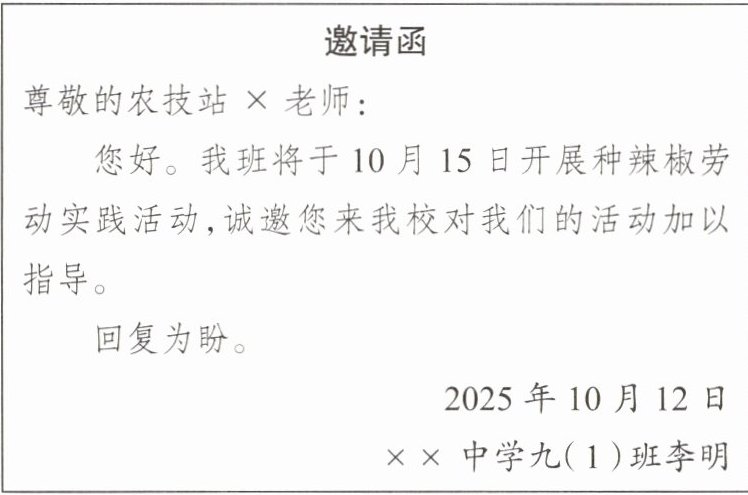 5. 你班计划于 2025 年 10 月 15 日上午 8 点至 12 点开展种辣椒的劳动实践活动,将邀请农技站技术员前来指导。下面是班长写的邀请函,其中有 1 处内容和 1 处格式问题,请找出来并改正。