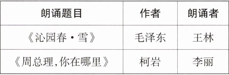 6.示例一:有一首词,以咏雪起兴,赞美祖国的山河,评论祖国的历史,歌颂祖国的今天与未来,脍炙人口,古今绝唱,这就是毛泽东的《沁园春·雪》。下面请欣赏王林带来的诗朗诵《沁园春·雪》。 示例二:有这样一个人,他从小就立下了“为中华之崛起而读书”的壮志,为了劳苦大众的解放和人民的幸福生活,可谓“鞠躬尽瘁,死而后已”。他的离去,举国同悲;这一声声的呼唤,是无数中国人的心声。下面请欣赏李丽同学的诗朗诵《周总理,你在哪里》。
