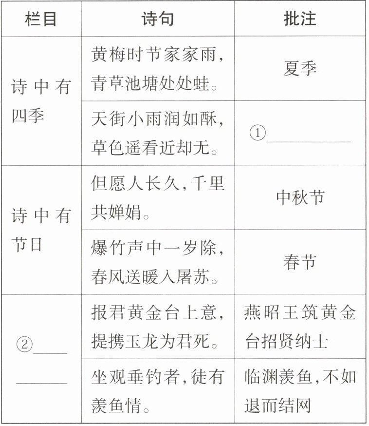 6. 【分门别类辑古诗】请按要求填写栏目名称或内容,完成古诗分类。