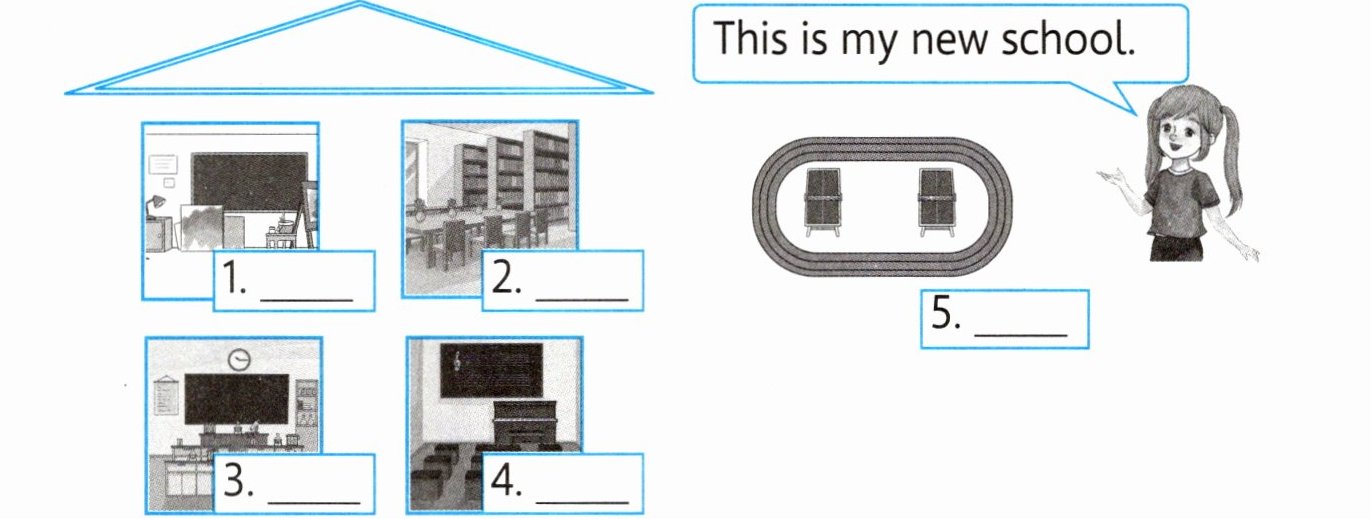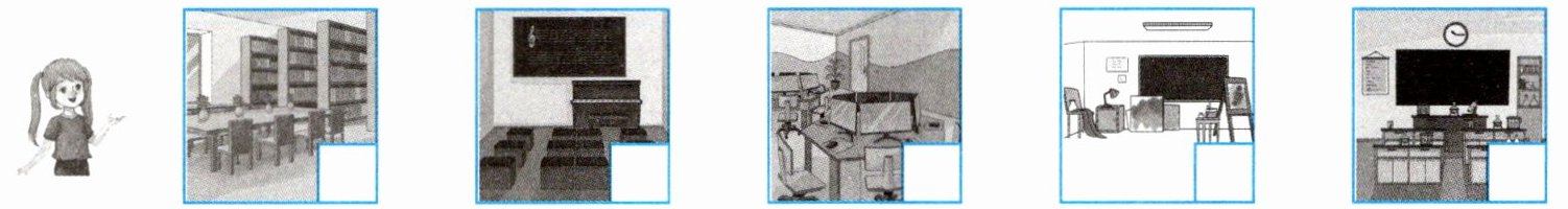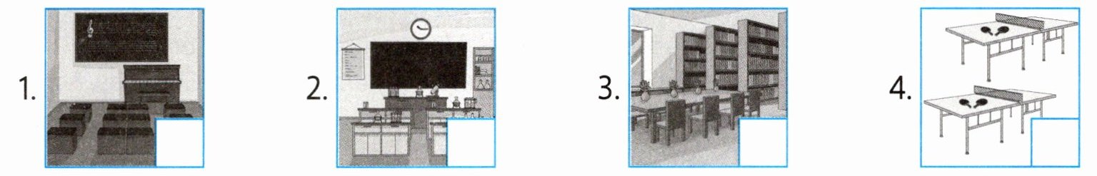 Ⅲ. Read and choose. Maisy 手绘了学校的示意图。读一读,从方框中找出与图片相符的名称,将字母序号写在横线上。