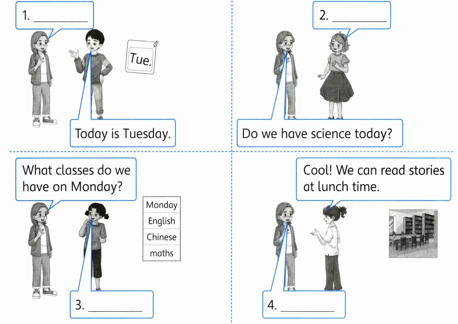 A. There’s a new library. B. No, we don’t. C. What day is it today? D. We have maths, Chinese and English.