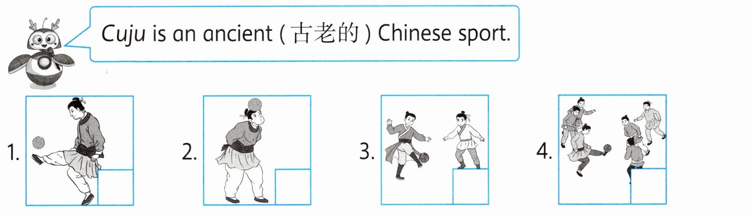 Ⅴ. Read and choose. “蹴鞠场边万人看,秋千旗下一春忙”。你知道蹴鞠吗?读一读,选出与图片相符的描述,将字母序号写在方框里。