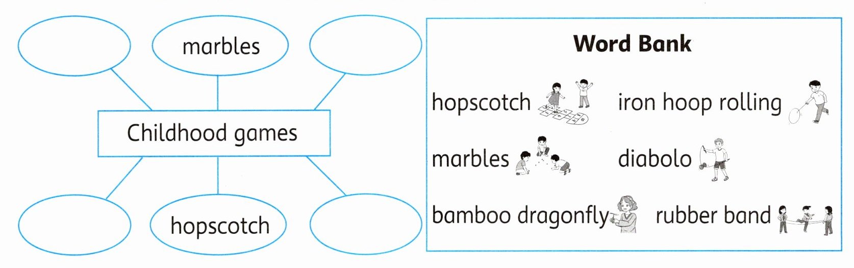 Ⅵ. Share and play. 你还知道哪些童年游戏?放风筝、跳房子、弹弹珠……选择一项你喜欢的游戏,向同伴介绍,并一起玩玩吧。