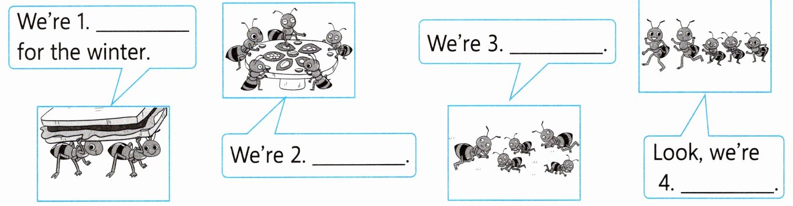 Ⅴ. Read and choose. 小蚂蚁一家在做什么呢?读一读,选择与图片相符的单词或短语,把故事补充完整,将字母序号写在横线上。