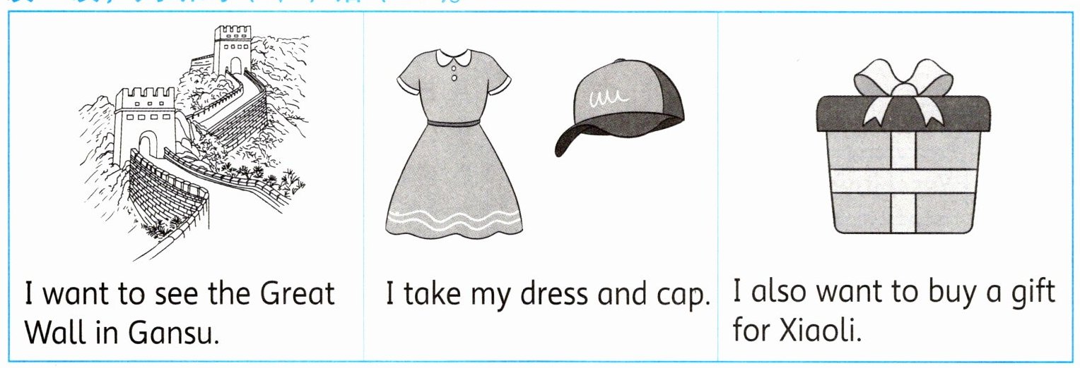 |I want to see the Great Wall in Gansu.|I take my dress and cap.|I also want to buy a gift for Xiaoli.|