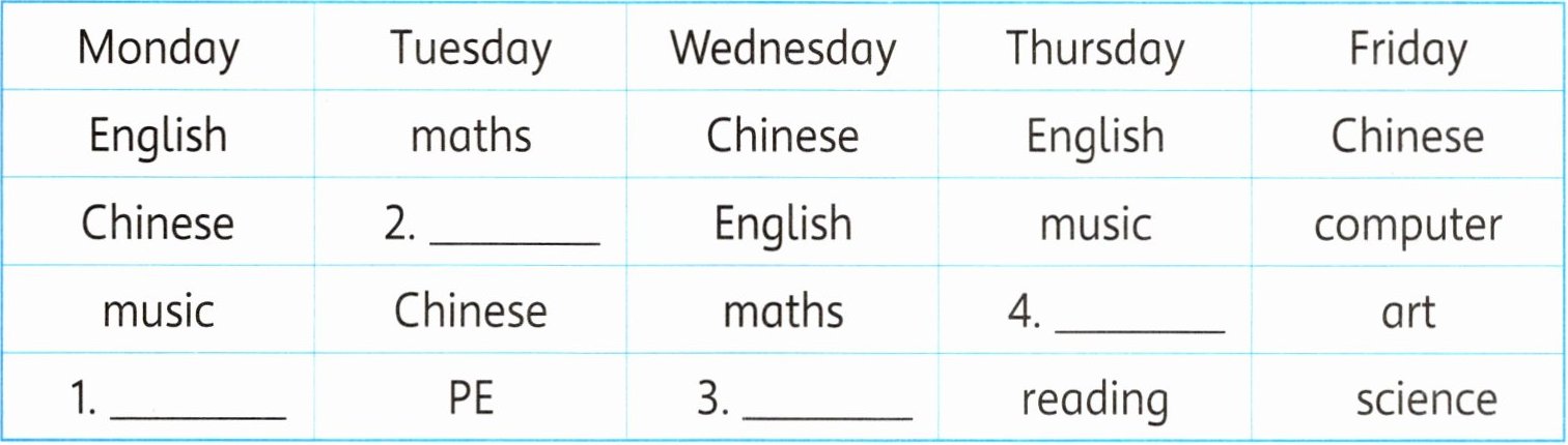 Linlin 正在向 Maisy 介绍新学期的课程。读一读,请你帮 Maisy 把课程表补充完整。