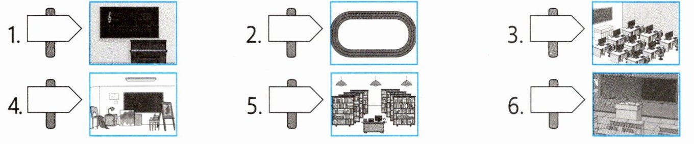 Ⅲ. Look and choose. 新学期,Xiaohua 的学校翻新了许多场所。看一看,从方框中选出适当的词语,将字母序号写在指示牌里。