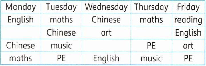 1. playground 2. ping-pong 3. library 4. Tuesday, Thursday