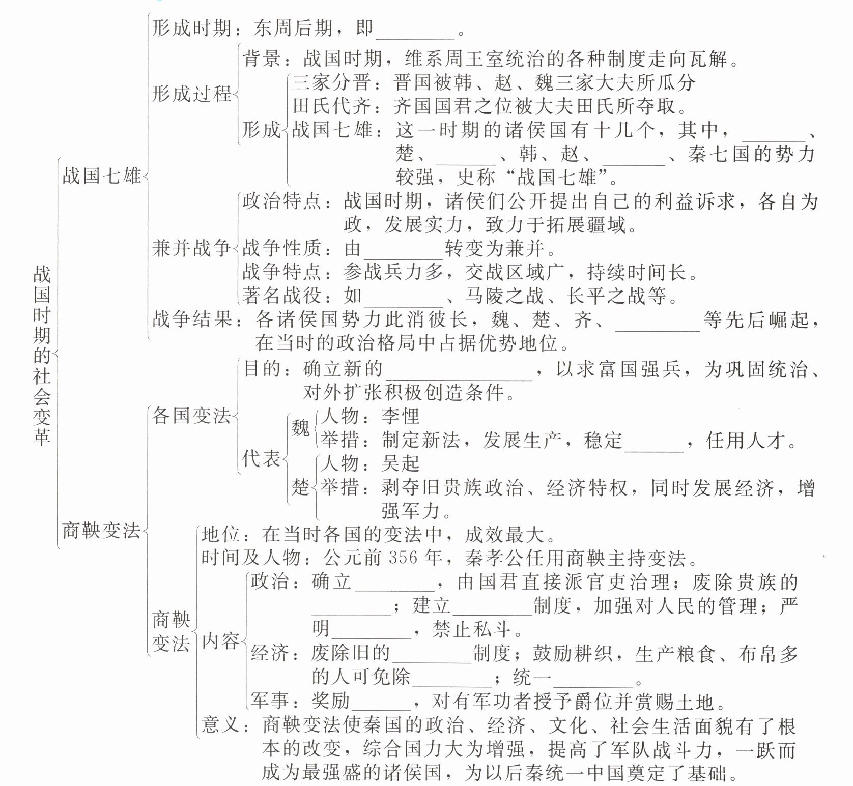 形成:战国七雄:这一时期的诸侯国有十几个,其中,齐、楚、燕、韩、赵、魏、秦七国的势力较强,史称“战国七雄”。