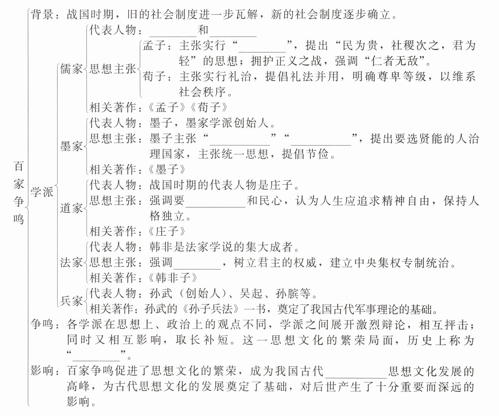 **争鸣**:各学派在思想上、政治上的观点不同,学派之间展开激烈辩论,相互抨击;同时又相互影响,取长补短。这一思想文化的繁荣局面,历史上称为“