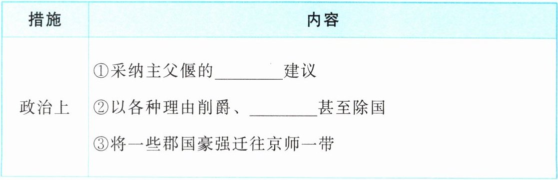6. 某校七年级(1)班同学在学习《大一统王朝的巩固》这一课时,对西汉的政治、经济等措施进行了探讨,请你参与,完成下列要求。