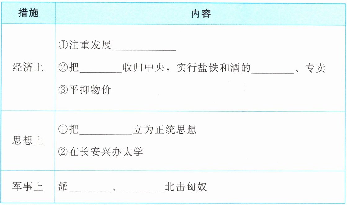 、专卖(2)请你结合所学知识填写汉武帝在位时期,在政治、经济、思想、军事上采取的相关措施。