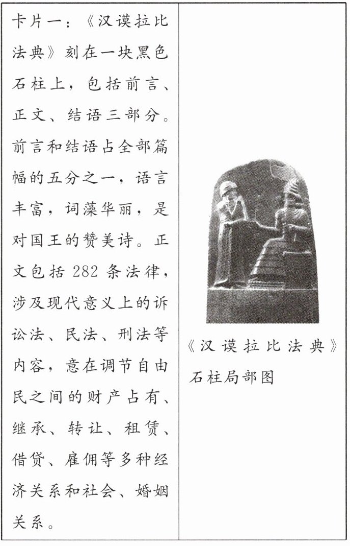 (2)地位:《汉谟拉比法典》是迄今已知世界上第一部较为完整的成文法典。历史意义:是古巴比伦王国留给人类的宝贵文化遗产,表明人类社会的法制传统源远流长。历史影响:对财产、买卖、债务、契约关系等作出明确规定,奠定了欧洲民法的基础;一定程度上改善了奴隶的地位等。