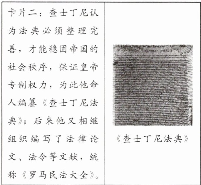 (2)简述材料二中卡片一文物的地位与历史意义,并概括卡片二提到的《罗马民法大全》的历史影响。