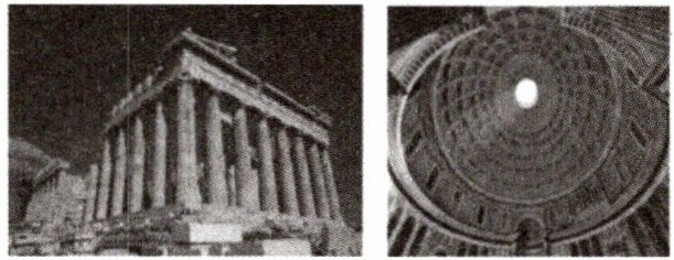 (3)特点:帕特农神庙四周以廊柱环绕,柱身有粗有细;罗马万神庙既坚固结实,又华丽宏伟。联系:罗马建筑吸收了希腊建筑的特点并有所创新,如穹顶、石拱门等。
