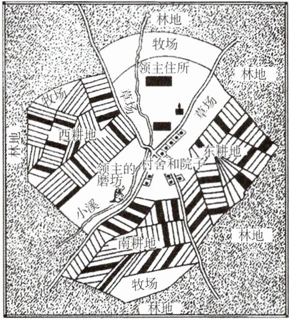(1)庄园的耕地分为领主的“自营地”和佃户(包括自由农民和缺少自由的农奴)的“份地”两部分。庄园周围的林地、荒地等被称为“共用地”。全体佃户都可以放牧,共同使用。