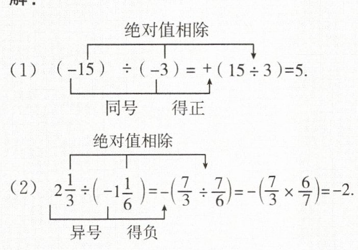 (1) 两数相除,同号得______,异号得负,且商的绝对值等于被除数的绝对值除以______的绝对值的商;
