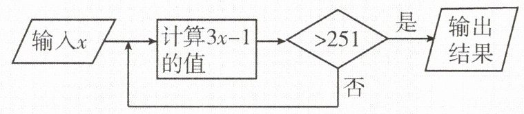 解析:先代入 38 计算,再判断是否能输出. 若不能输出,则再次代入计算. 当输入 38 时,$ 3x - 1 = 3×38 - 1 = 113 $. 因为 $ 113 < 251 $,所以需再次输入,$ 3x - 1 = 3×113 - 1 = 339 - 1 = 338 $. $ 338 > 251 $,所以输出 338.