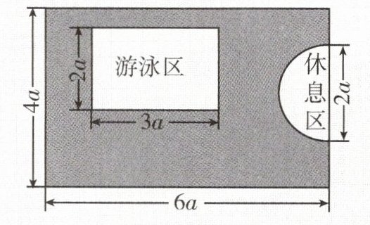 5. 如图,某个长方形游乐场的宽是$4a\ m$,长是$6a\ m$. 其中半圆形休息区和长方形游泳区以外的地方都是绿地. 已知半圆形休息区的直径和长方形游泳区的宽都是$2a\ m$,游泳区的长是$3a\ m$.