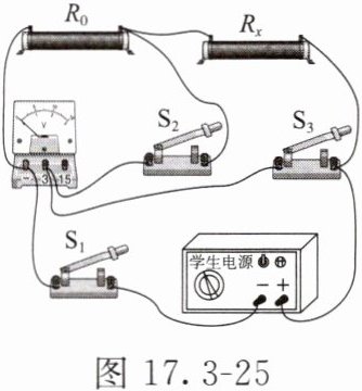 (4) 该同学进行了实验创新,利用定值电阻(电阻为$R_0$)和电压表等器材,测量未知电阻$R_x$。他设计了如图 17.3 - 25 所示的电路,经检查无误后进行实验。请将下列实验过程补充完整: