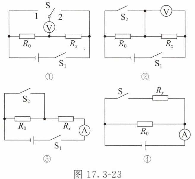 图 17.3 - 23 是小科利用实验室常用仪器设计测量未知电阻$R_x$的四种电路。假设电源电压恒定且未知,定值电阻的电阻是$R_0$,滑动变阻器 R 的最大电阻未知,实验中只能闭合或断开开关及移动滑动变阻器的滑片,则能够测量出未知电阻$R_x$的电路是(