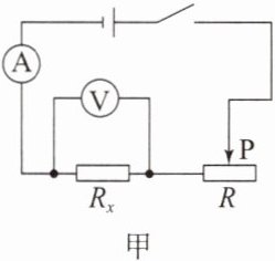 某同学利用有关器材测量未知电阻$R_x$。可选用的器材有电源(电压恒为 6 V)、三个滑动变阻器[规格分别为 a(5 Ω 2 A)、b(30 Ω 2 A)和 c(50 Ω 1 A)]、电流表(有 0~0.6 A 和 0~3 A 两个测量范围)、电压表(有 0~3 V 和 0~15 V 两个测量范围)、开关、导线等。该同学根据图 17.3 - 24 甲所示电路图进行了正确的实验操作,当滑动变阻器的滑片 P 处于中间位置附近时,两电表的示数如图 17.3 - 24 乙所示。请你根据以上信息回答问题。