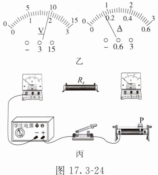 Ω(结果精确到一位小数)。(3) 请根据图甲所示电路图,正确选用电表的测量范围,用笔画线表示导线,完成图 17.3 - 24 丙所示实物图的连接。