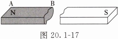 8. 小明不小心将条形磁体从中间摔成了两半,他拿起标注为N极的一半磁体,这段磁体两端为A、B,如图20.1 - 17所示,他认为这段磁体只有一个磁极N极。请你自选器材,证明他的观点是错误的。
