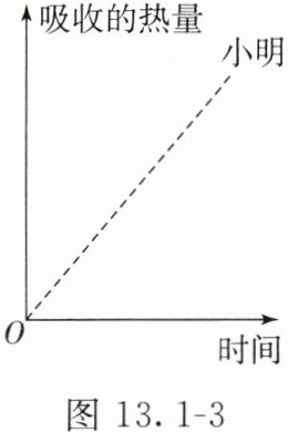2. 小明和小玉用相同的加热装置对初温相同的水进行加热(水未沸腾),小明加热的水质量少,小玉加热的水质量多(其他条件均相同)。图13.1-3中虚线是小明绘制的水吸收的热量随时间变化的图像,请以小明绘制的图像为参考,在图中用实线绘制小玉加热的水吸收的热量随时间变化的图像。