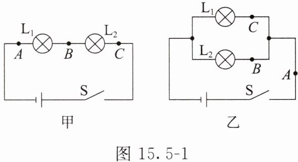 在串联电路(图 15.5 - 1 甲)中,用电流表分别测出 $A$、$B$、$C$ 三点的电流 $I_A$、$I_B$、$I_C$。由测量发现 $I_A = I_B = I_C$,研究表明:在串联电路中,电流
