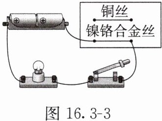 1. 如图 16.3 - 3 所示,把长短、粗细相同的铜丝和镍铬合金丝分别接入电路。闭合开关后,发现把镍铬合金丝接入电路时灯泡亮度更暗,这是因为镍铬合金丝的