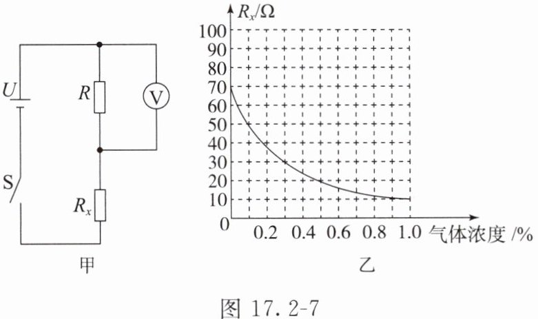 6. 如图 17.2 - 7 甲所示是小华设计的天然气浓度测试仪电路,电源电压 $U$ 恒为 $4\ V$,定值电阻的电阻为 $R$,电压表的测量范围为 $0\sim3\ V$,将电压表作为气体浓度的显示装置。气敏电阻的电阻 $R_x$ 与气体浓度的关系如图 17.2 - 7 乙所示。当气体浓度增加时,电阻 $R_x$ 将______,电压表的示数会______。要求将电压表的示数为 $1.5\ V$ 处标为气体浓度 $0.5\%$,定值电阻的电阻 $R$ 应为______$\Omega$。若长时间使用后,电源电压降低,则测量结果______(选填“大于”“小于”或“等于”)实际的气体浓度。
