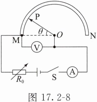 7. 新房装修时,工人经常用普通量角器测量一些角度,不方便读数。小明根据所学的知识设计了电子量角器,电路如图 17.2 - 8 所示,电流表的测量范围为 $0\sim0.6\ A$,电压表的测量范围为 $0\sim3\ V$,$O$ 为半圆弧电阻 $MN$ 的圆心,$O$ 到滑片 $P$ 的距离为半径,与半圆弧接触良好,接入电路的电阻 $R_{MP}$ 与指针旋转角度 $\theta$ 成正比,电源电压恒为 $6\ V$,电阻箱的电阻为 $R_0$。将滑片 $P$ 旋转至 $M$ 处,调节电阻 $R_0$,使电路中电流为 $0.6\ A$。
