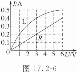 5. 图 17.2 - 6 所示为小灯泡 $L$ 和定值电阻(电阻为 $R$)的 $I - U$ 图像,若将小灯泡和定值电阻并联在电源电压为 $3\ V$ 的电路中,则干路电流为