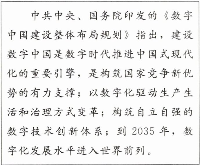 中共中央、国务院印发的《数字中国建设整体布局规划》指出,建设数字中国是数字时代推进中国式现代化的重要引擎,是构筑国家竞争新优势的有力支撑;以数字化驱动生产生活和治理方式变革;构筑自立自强的数字技术创新体系;到2035年,数字化发展水平进入世界前列。