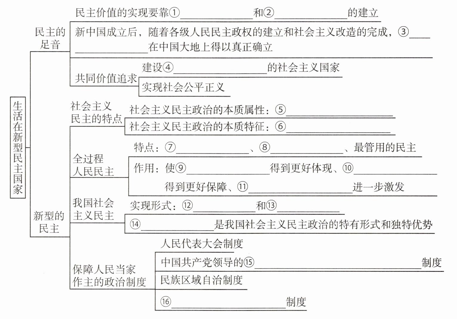 ①民主形式 ②民主制度 ③社会主义民主④人民当家作主 ⑤全过程人民民主⑥人民当家作主 ⑦最广泛 ⑧最真实⑨人民意志 ⑩人民权益 ⑪人民创造活力⑫选举民主 ⑬协商民主 ⑭协商民主⑮多党合作和政治协商 ⑯基层群众自治