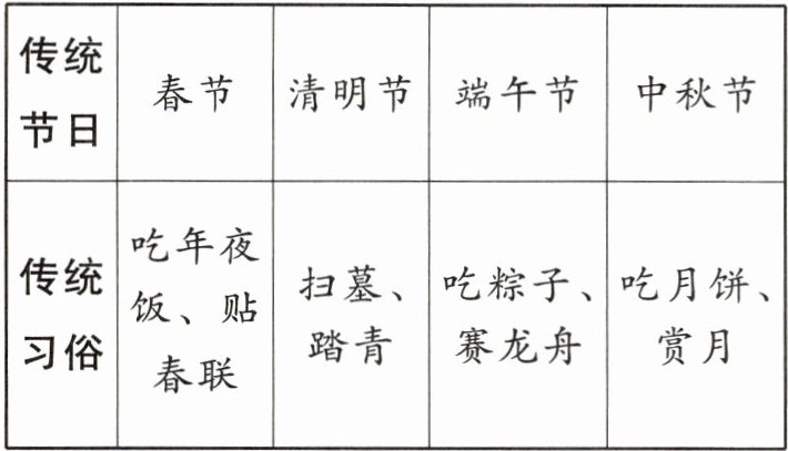 材料二 生活在海外的很多华人,除了参加他们现在居住国的民族节日外,每逢祖国的传统节日,他们仍然会按国内的习俗过节,保留了一些传统习俗,如下表所示:
