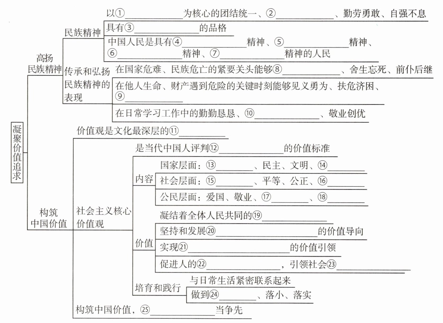 ①爱国主义 ②爱好和平 ③与时俱进④伟大创造 ⑤伟大奋斗 ⑥伟大团结⑦伟大梦想 ⑧挺身而出 ⑨无私奉献⑩任劳任怨 ⑪内核 ⑫是非曲直⑬富强 ⑭和谐 ⑮自由 ⑯法治⑰诚信 ⑱友善 ⑲价值追求⑳中国特色社会主义㉑中华民族伟大复兴 ㉒全面发展㉓全面进步 ㉔落细 ㉕中国少年