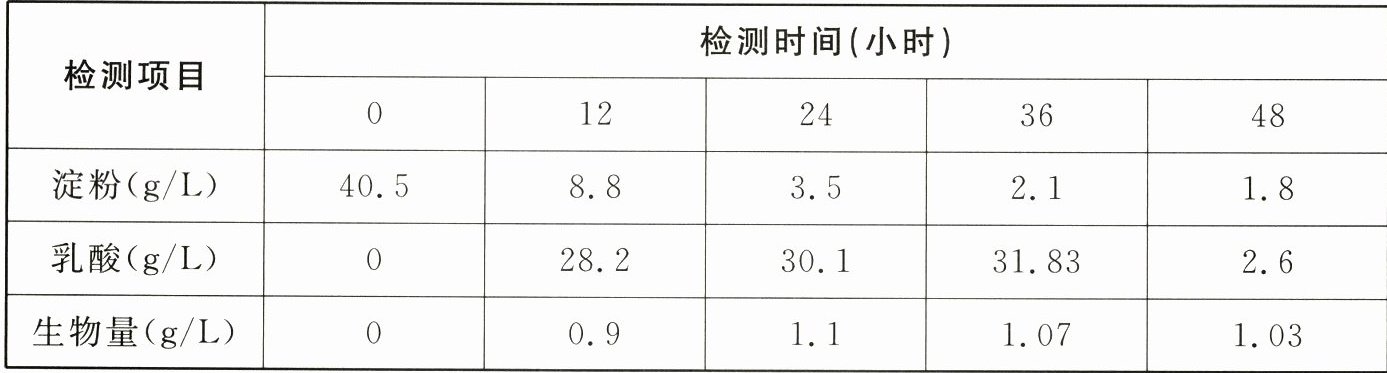 。(3)研究者进一步检测了该菌株发酵液中淀粉、乳酸及生物量(乳酸杆菌的总质量)随时间的变化,结果如表所示,