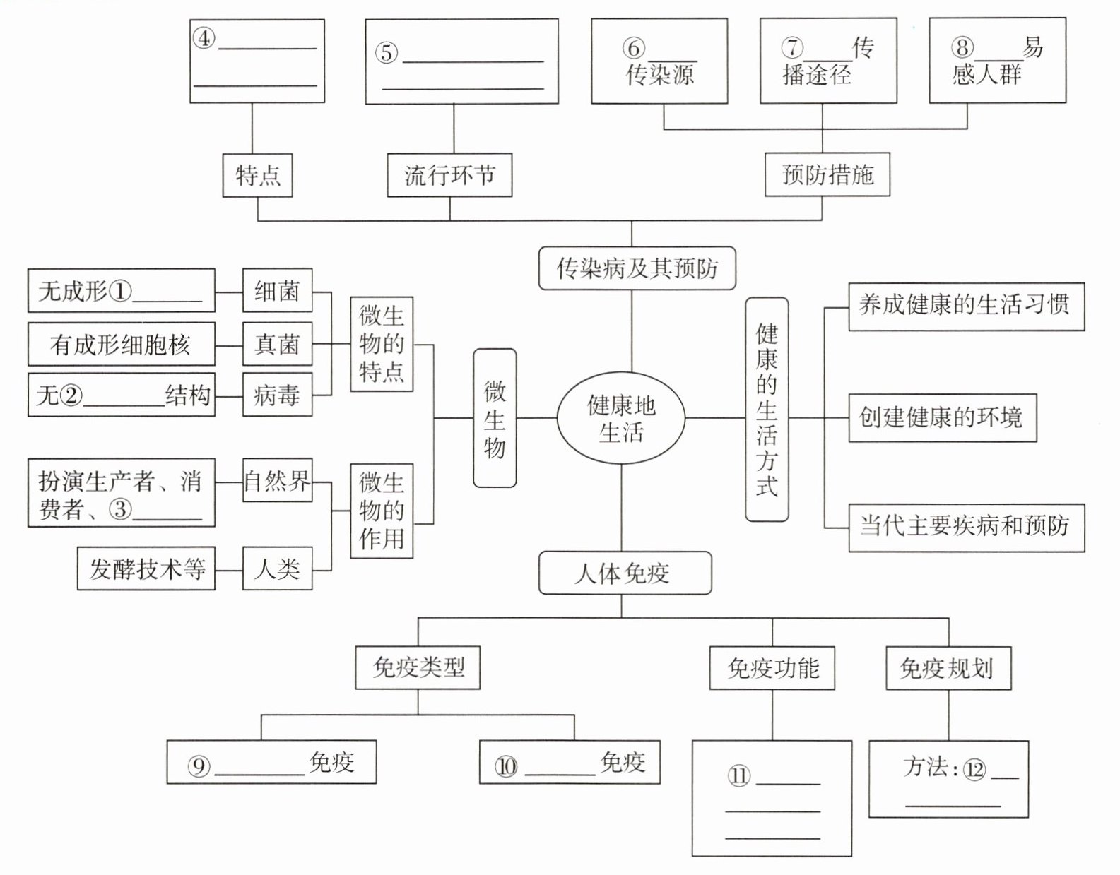 ④传染性、流行性;⑤传染源、传播途径、易感人群;⑥控制;⑦切断;⑧保护;①细胞核;②细胞;③分解者;⑨非特异性;⑩特异性;⑪自我稳定、防御、监视;⑫预防接种