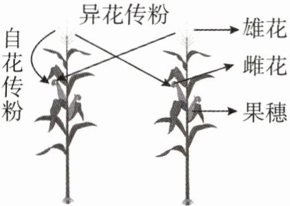 16. 玉米是雌雄同株、异花的植物,其植株形态结构及间行种植的传粉方式如图所示。玉米籽粒味道的甜味与非甜味是一对相对性状,由一对基因($A$、$a$)控制,现有甲、乙、丙三株玉米植株,经检测这三株玉米植株的基因型各不相同(与甜味、非甜味相关的基因),为研究其遗传情况,科研人员对套袋处理的果穗进行人工授粉,所结籽粒的性状表现及数量统计如下表。分析回答下列问题。