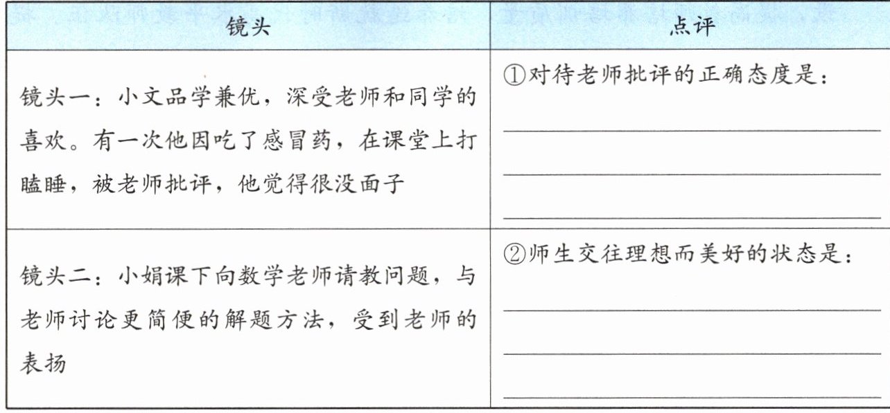 材料三:“亲其师,信其道。”处理好师生关系是学校生活的一个重要内容。下面是师生交往的两组镜头,请你进行点评。