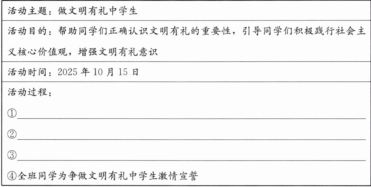 (2)①大家一起观看文明有礼宣传片。②以小组为单位分享感悟。③讲述身边文明有礼榜样的事迹。(符合题意即可,每点2分,共6分)