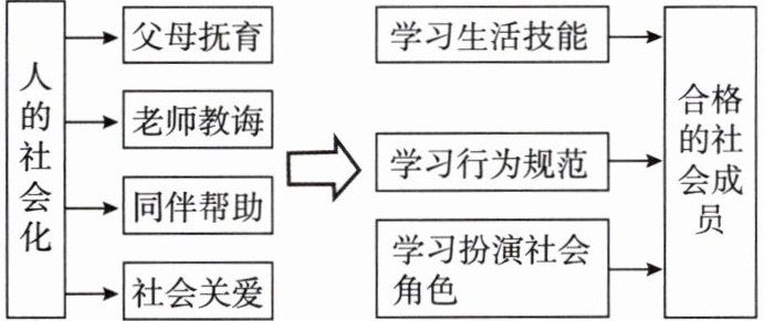 点拨 本题是一道框架类选择题。本题以思维导图的形式建构本课时的知识框架,实现对内容的结构化呈现,帮助学生直观形象地理解所学知识;以思维导图的形式考查学生对人的社会化的理解,同时考查学生的认知和思维能力。“人的成长是一个不断社会化的过程”符合该思维导图的主题,①正确;该思维导图中提到了父母、老师、同伴、社会等,说明人的成长过程离不开各种社会因素的支持,反映出社会生活中很多人为我们的成长提供了必要的支持,②正确;在我们的成长过程中,我们会接触不同的人际关系,处于不同的环境,扮演不同的社会角色,④正确;社会化学习,是一种综合的、全面的学习,而不仅强调在校期间的学习,③错误。