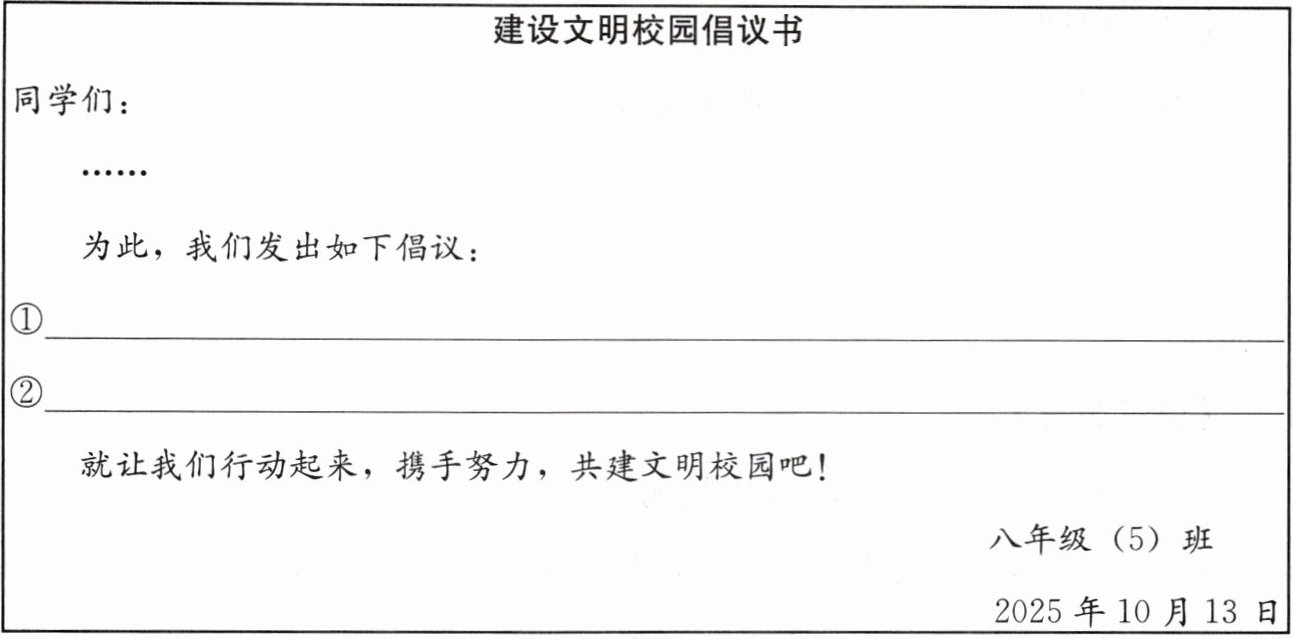 情境二 为贯彻落实创建全国文明城市的工作要求,学校开展了以“礼貌·诚信·友善”为主题的建设文明校园系列活动。为了动员大家积极参与活动,八年级(5)班同学准备写一份建设文明校园倡议书。